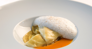 Raviole de rocamadour frais et picota, purée de mangue et cappuccino fève de tonka