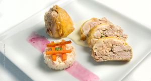 Ballotines de cuisses de poulet fermier du Ségala, risotto au piment d’Espelette et légumes
